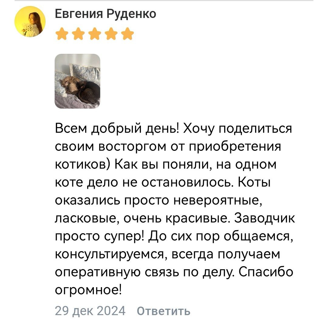 Оплата производится поэтапно: для бронирования котёнка необходимо внести депозит (15.000р) — он входит в стоимость питомца. Остаток суммы оплачивается при передаче котёнка. Мы принимаем оплату удобными способами — наличными или банковским переводом.